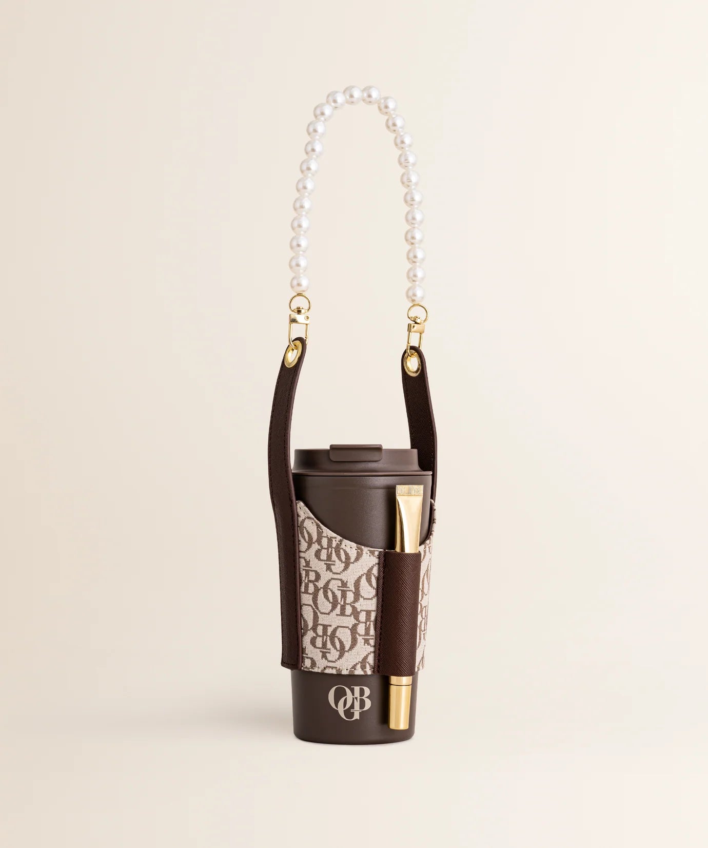 De houder is uitgevoerd in onze signature jacquard print, afgewerkt met een chic handvat voorzien van pareldetails en donkerbruine accenten in leerlook. De herbruikbare koffiebeker is uitgevoerd in diep donkerbruin en subtiel voorzien van het OGB-logo.