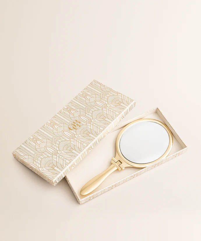 Een snelle make-up check? De Olcay Gulsen Beauty Merry Mirror is dé ultieme combinatie van glamour en functionaliteit. De gouden handspiegel is voorzien van het iconische OGB-logo en heeft een glanzende, pearlescent finish met subtiele gouden details die elke kaptafel een vleugje affordable luxury geeft. Ideaal om je make-up bij te werken of de achterkant van je coupe te checken voor je de deur uitgaat.